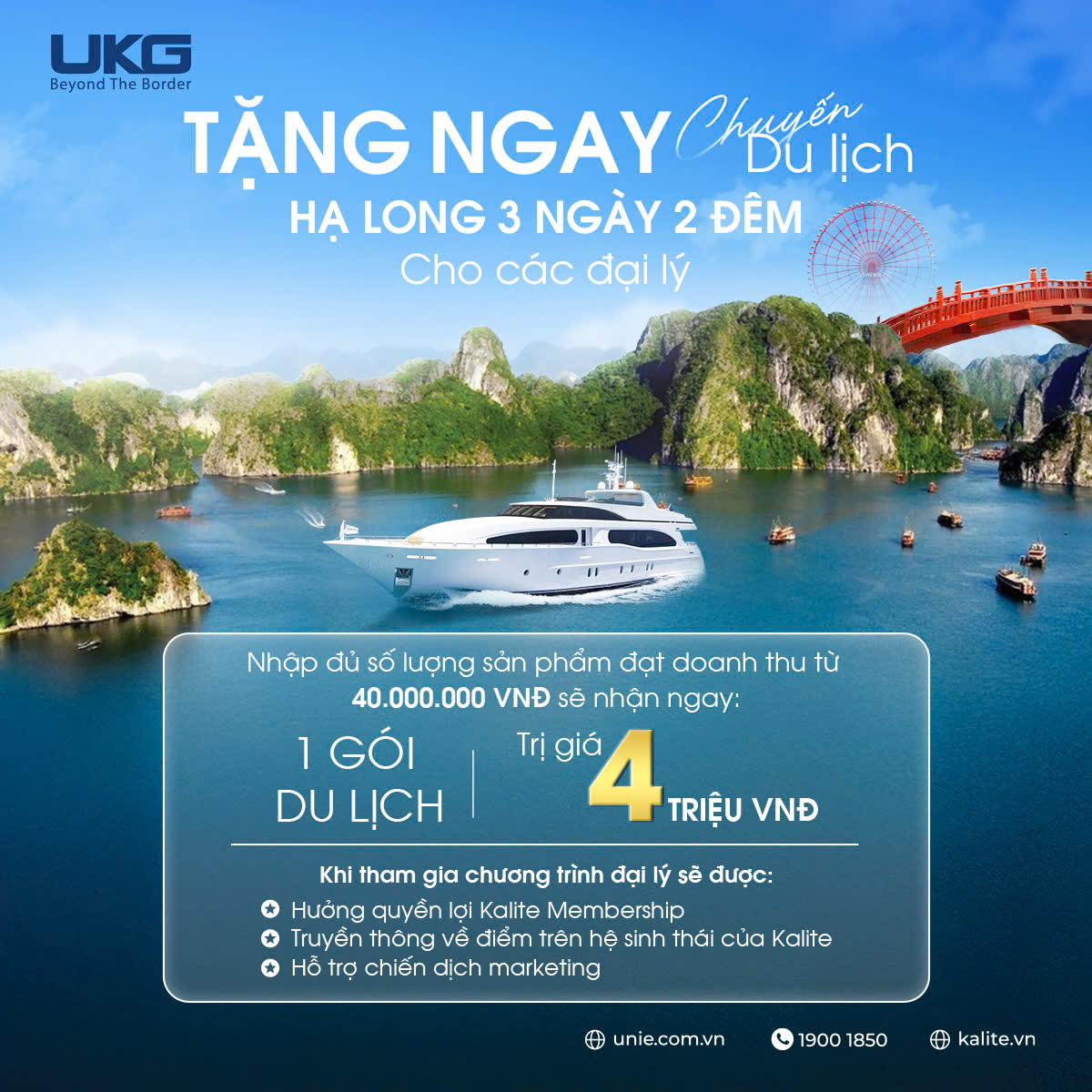 Phần thưởng dành cho những đại lý xuất sắc là chuyến du lịch nghỉ dưỡng cao cấp 3 ngày 2 đêm tại Vịnh Hạ Long – một trong những kỳ quan thiên nhiên nổi tiếng của thế giới. Với tổng giá trị lên tới 4.000.000 VNĐ mỗi suất, đây không chỉ là một món quà về vật chất, mà còn là lời tri ân đầy trân trọng từ Kalite – một cơ hội để Quý Đại lý thư giãn, tái tạo nguồn năng lượng tích cực, đồng thời tăng cường kết nối trong một không gian thiên nhiên tuyệt mỹ.