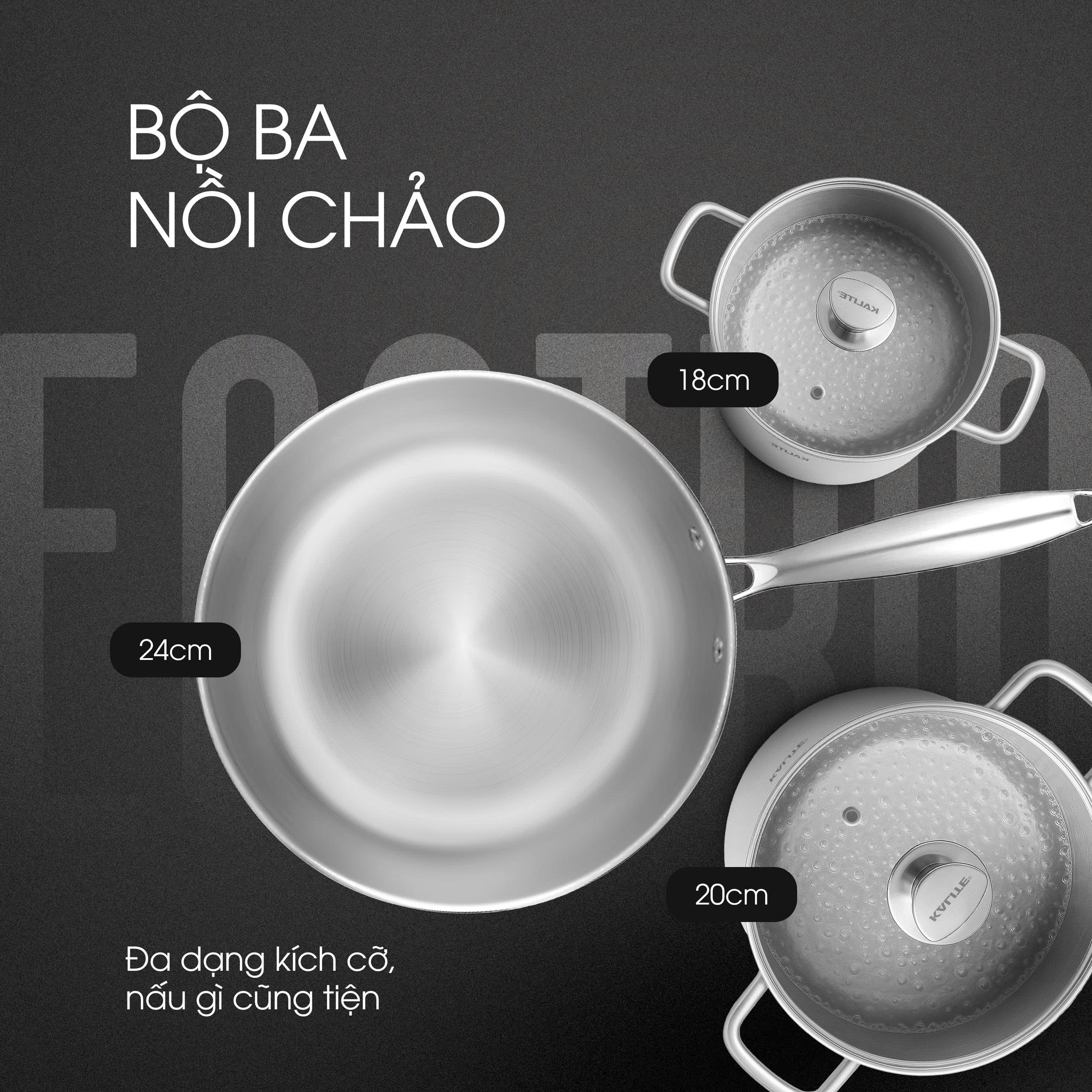 Bộ sản phẩm Kalite Eco Trio gồm ba kích cỡ tiêu chuẩn được thiết kế đồng bộ, phù hợp với mọi nhu cầu nấu nướng của gia đình hiện đại. Từ chiên, xào, luộc đến hầm, Eco Trio đều là giải pháp nấu nướng toàn diện cho mỗi bữa ăn đồng thời mang đến sự linh hoạt tối đa trong căn bếp.