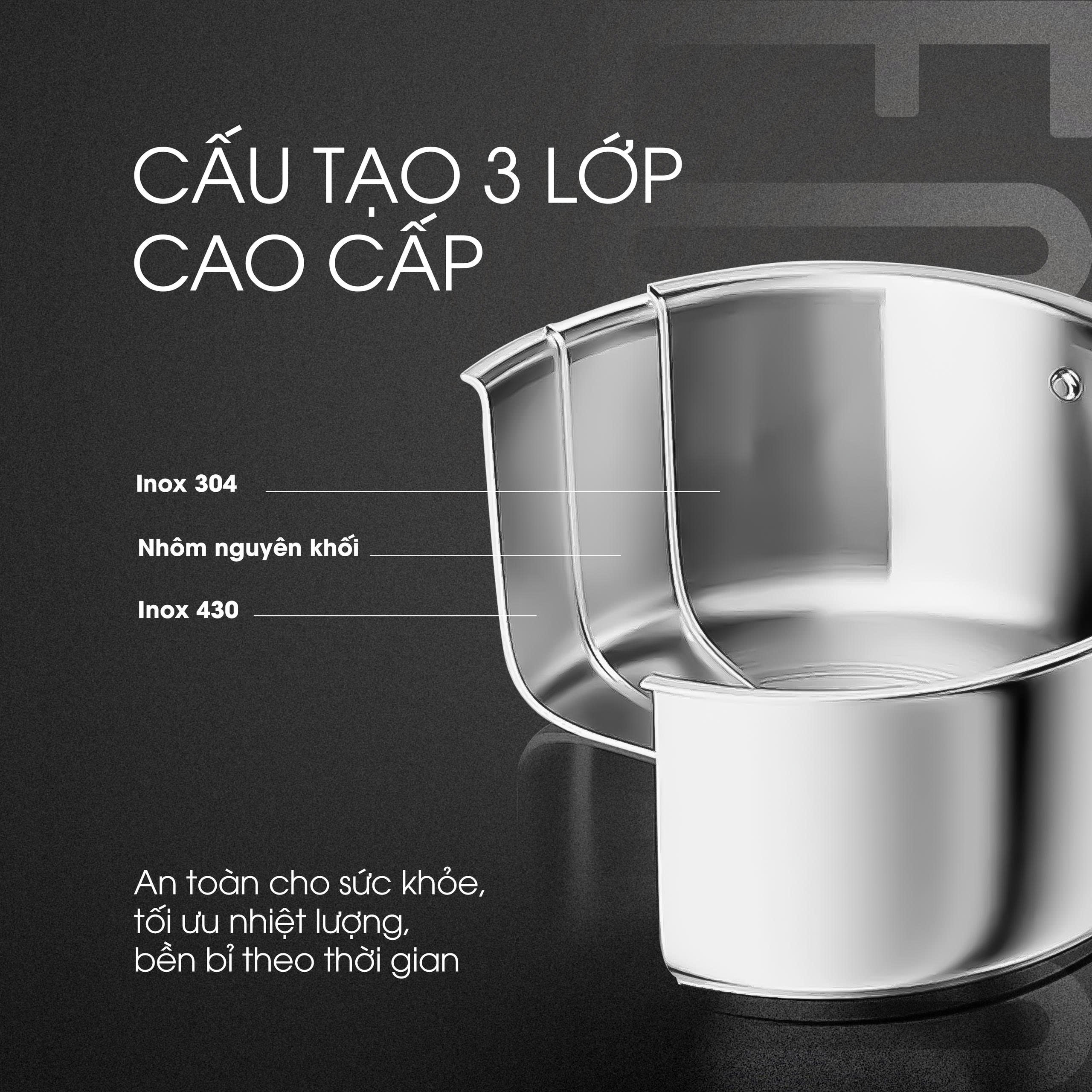 - Lớp ngoài – Inox 430: Tăng khả năng bắt từ lên tới 98%, tương thích với mọi loại bếp, chống cong vênh, bền bỉ theo thời gian.