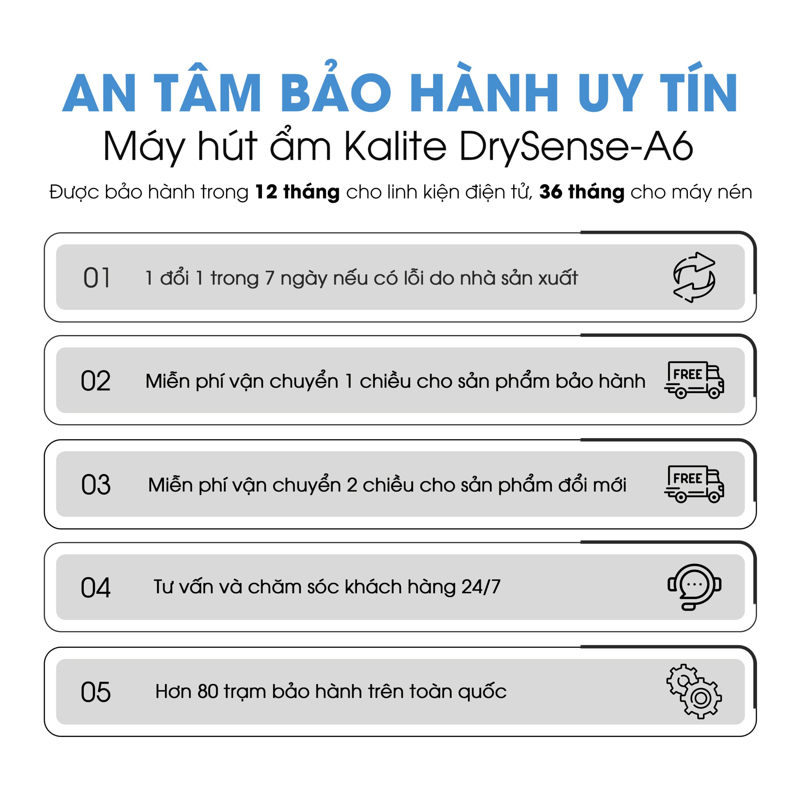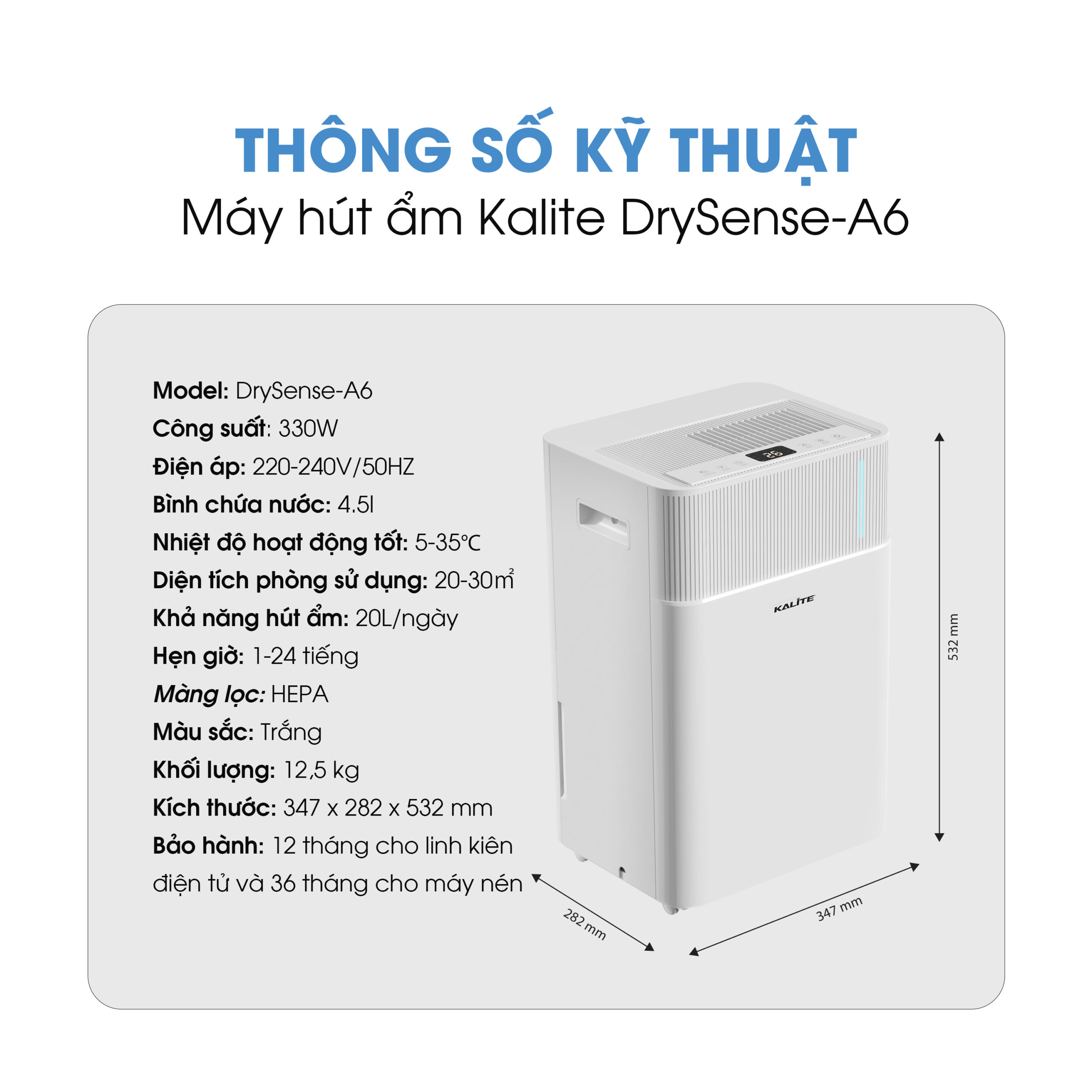 Máy hút ẩm Kalite Drysense A6 là giải pháp hoàn hảo cho không gian luôn khô thoáng, trong lành với các tính năng nổi bật: