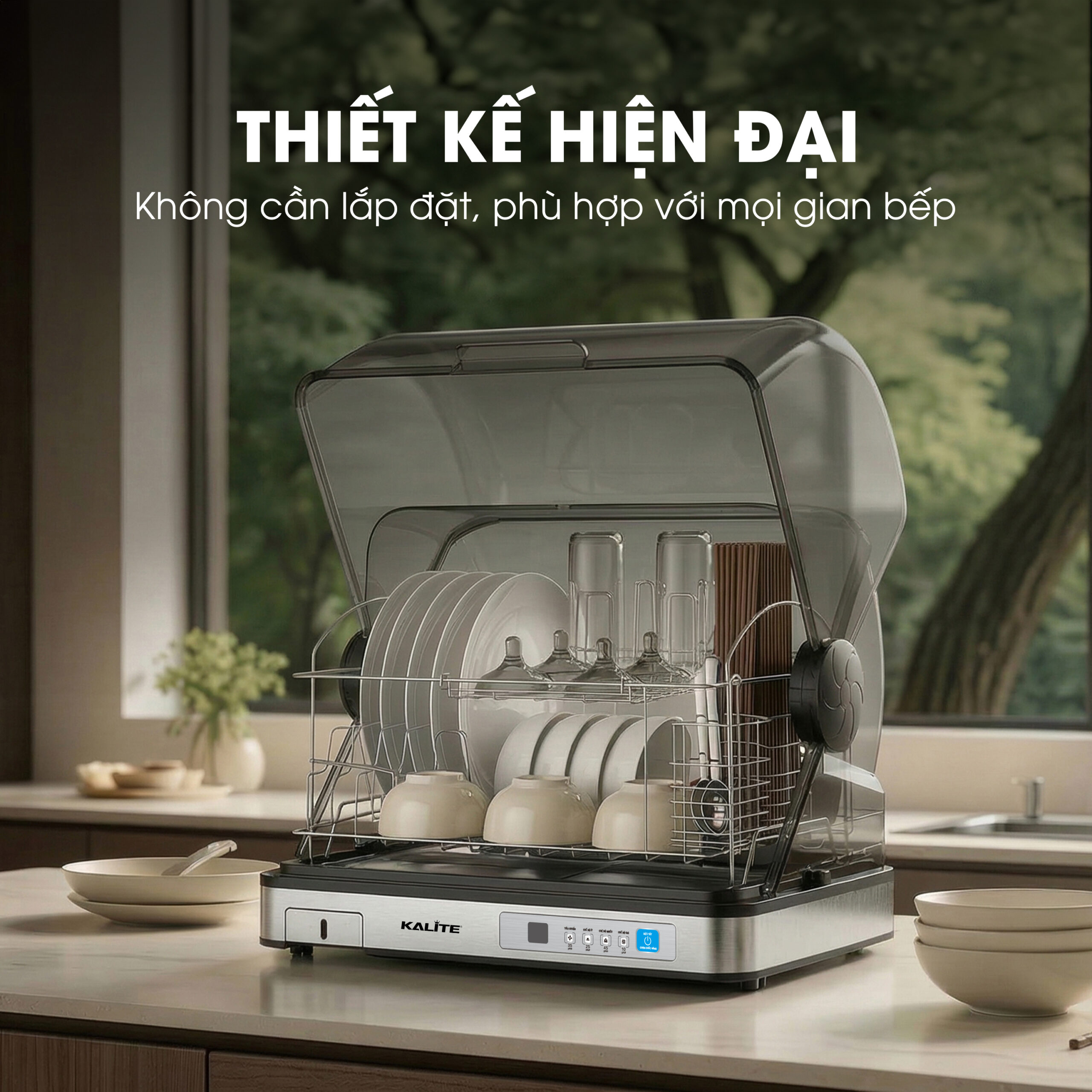 Máy diệt khuẩn bát đĩa Kalite Crystal Dry sở hữu thiết kế nhỏ gọn, hiện đại, có thể đặt trực tiếp trên kệ bếp mà không cần lắp đặt phức tạp. Chỉ cần đặt máy ở vị trí phù hợp là có thể sử dụng ngay, giúp tiết kiệm thời gian và tối ưu không gian bếp.