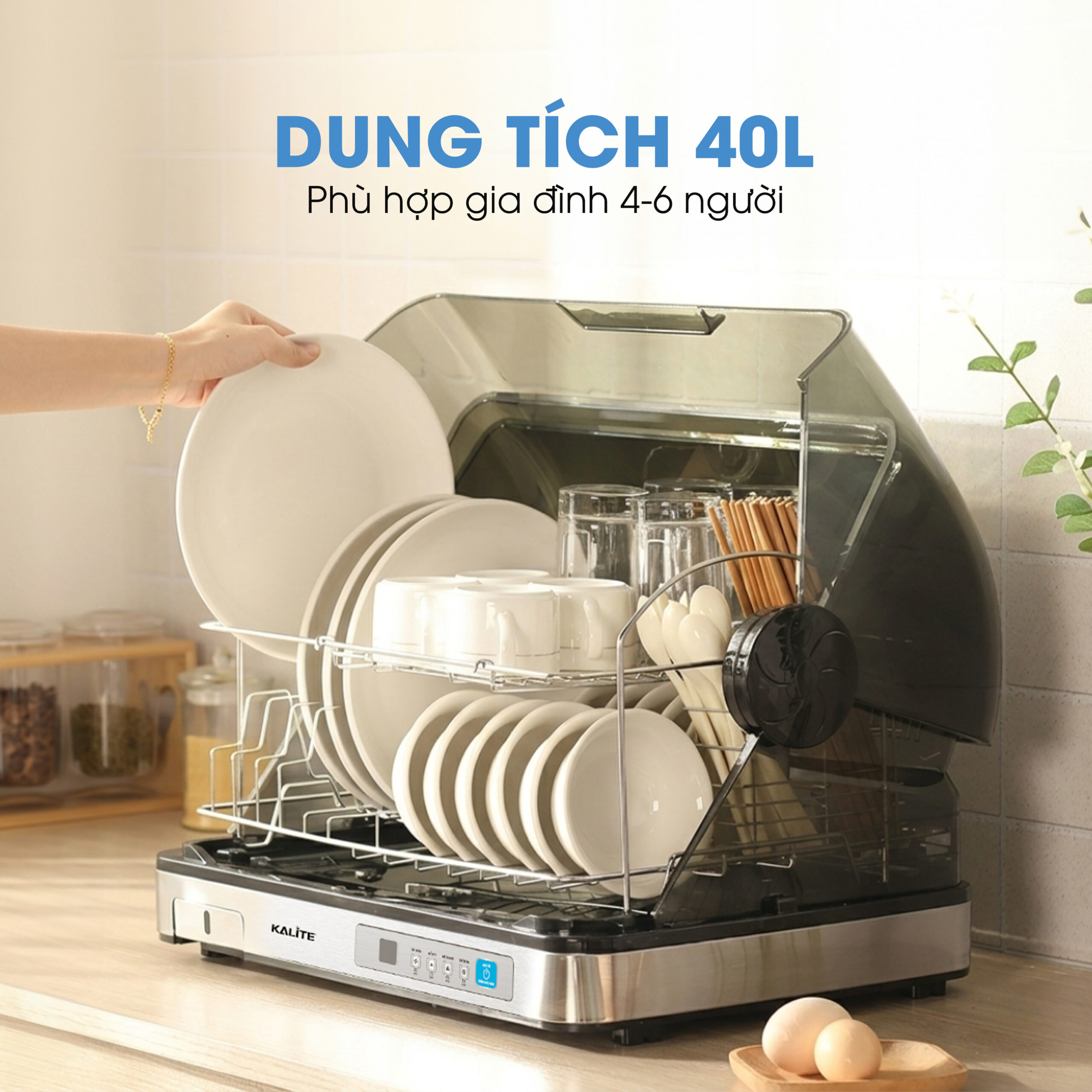 Với dung tích 40L rộng rãi, máy diệt khuẩn bát đĩa Kalite Crystal Dry có thể chứa lượng bát đĩa cho cả gia đình 4-6 người chỉ trong một lần sấy. Không gian bên trong được thiết kế hợp lý giúp dễ dàng sắp xếp nhiều loại bát, đĩa, cốc hay dụng cụ ăn uống khác nhau.