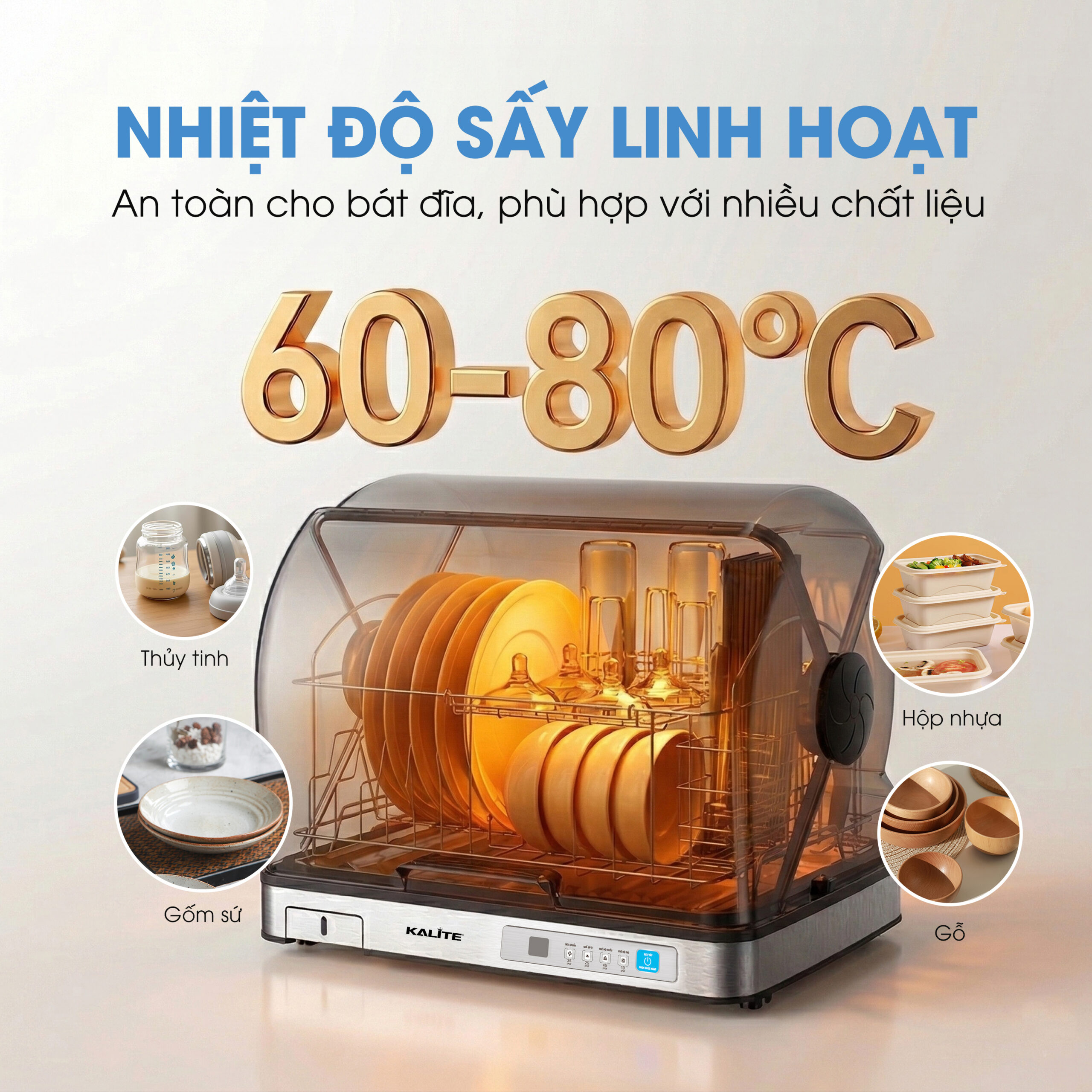 Máy diệt khuẩn bát đĩa Kalite Crystal Dry sử dụng mức nhiệt sấy linh hoạt từ 60-80°C, giúp làm khô bát đĩa hiệu quả mà vẫn an toàn với nhiều loại chất liệu như gốm sứ, thủy tinh hay nhựa chịu nhiệt. Nhiệt độ ổn định không chỉ giúp bát đĩa khô nhanh mà còn hạn chế vi khuẩn phát sinh.
