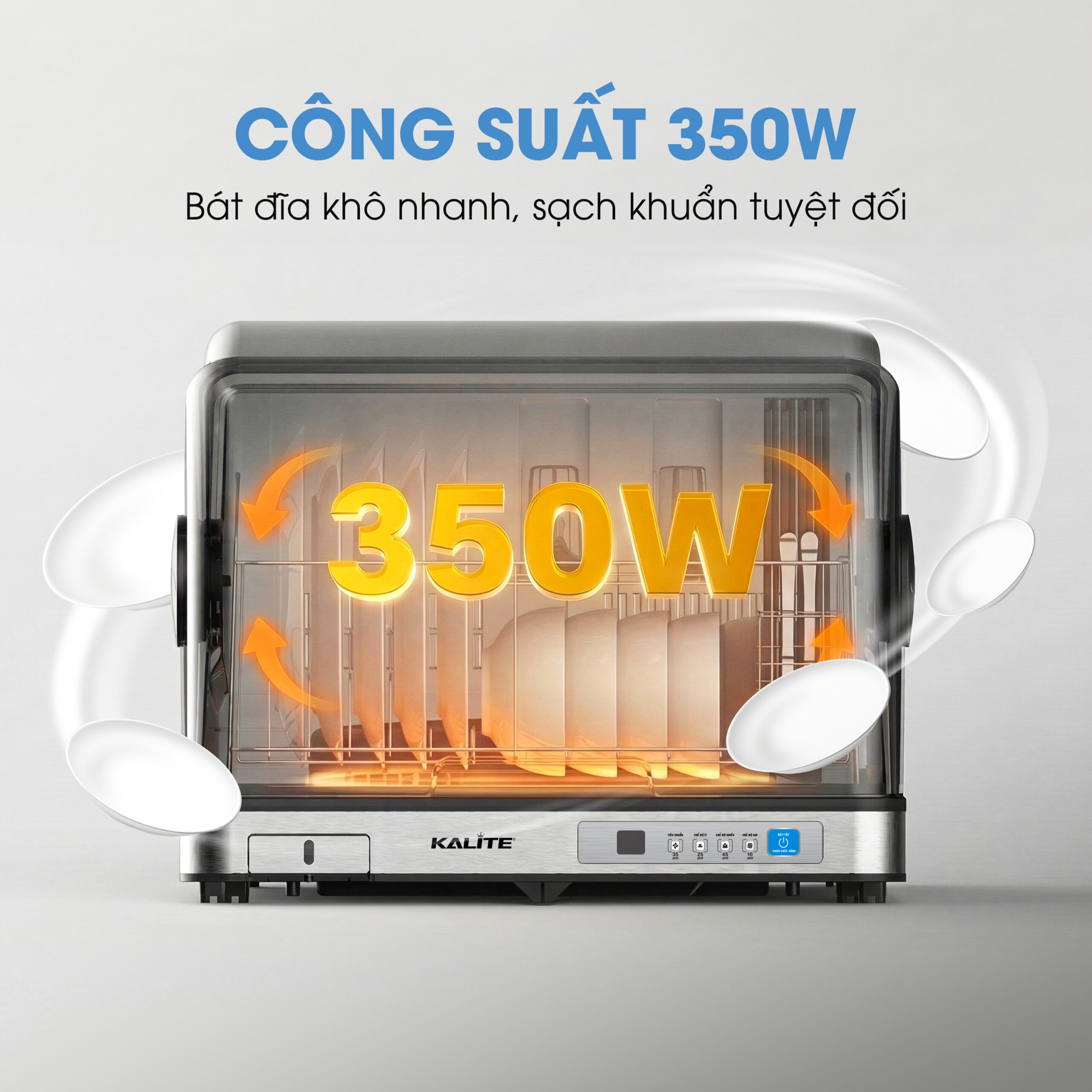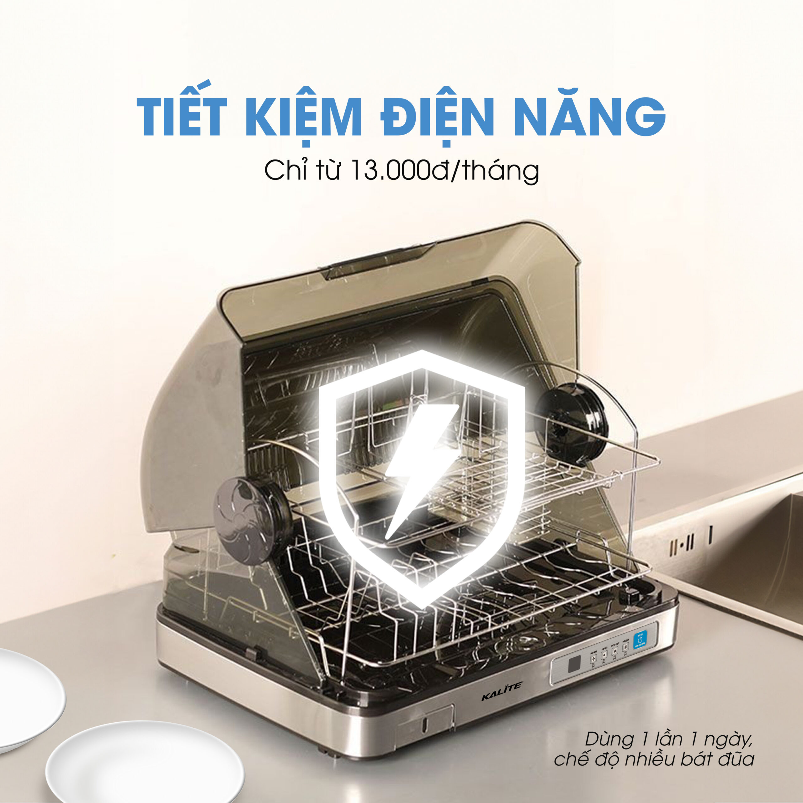 Máy diệt khuẩn bát đĩa Kalite Crystal Dry hoạt động với công suất 350W, đủ mạnh để làm khô bát đĩa nhanh chóng sau khi rửa mà vẫn tối ưu điện năng tiêu thụ. Với tần suất sử dụng khoảng 1 lần mỗi ngày, chi phí điện chỉ khoảng 13.000 đồng mỗi tháng, giúp duy trì thói quen sử dụng hằng ngày mà không lo tốn điện. Đây là giải pháp vừa tiện lợi vừa tiết kiệm cho gian bếp hiện đại.