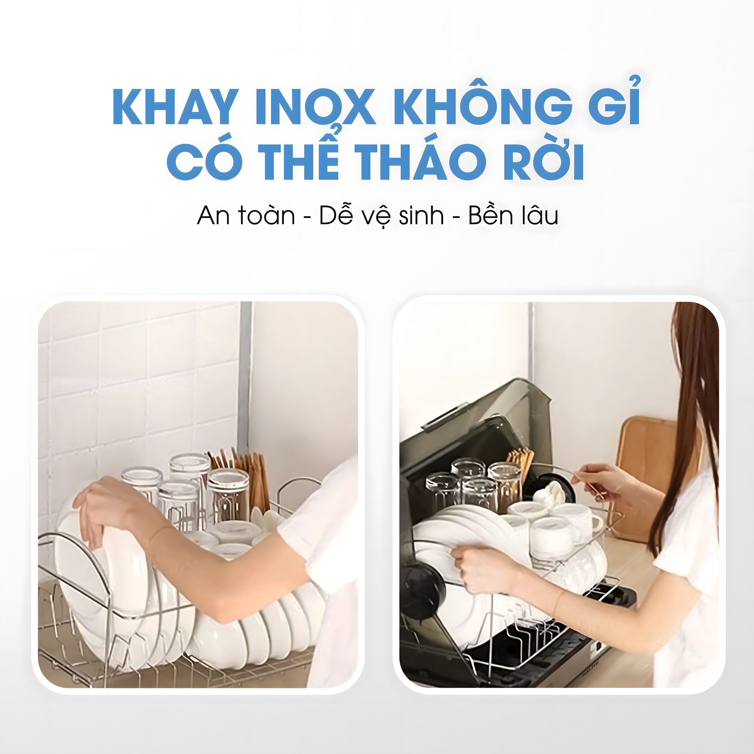 Kalite Crystal Dry được trang bị khay đựng inox cao cấp chống gỉ, giúp sắp xếp gọn gàng bát đĩa, cốc và các vật dụng ăn uống hằng ngày. Khay có thể tháo rời linh hoạt để tạo thêm không gian, thuận tiện khi cần sấy các vật dụng có kích thước lớn hơn như nồi hoặc hộp đựng thực phẩm. Chất liệu inox bền bỉ còn giúp đảm bảo an toàn khi sử dụng và dễ dàng vệ sinh sau mỗi lần sấy.