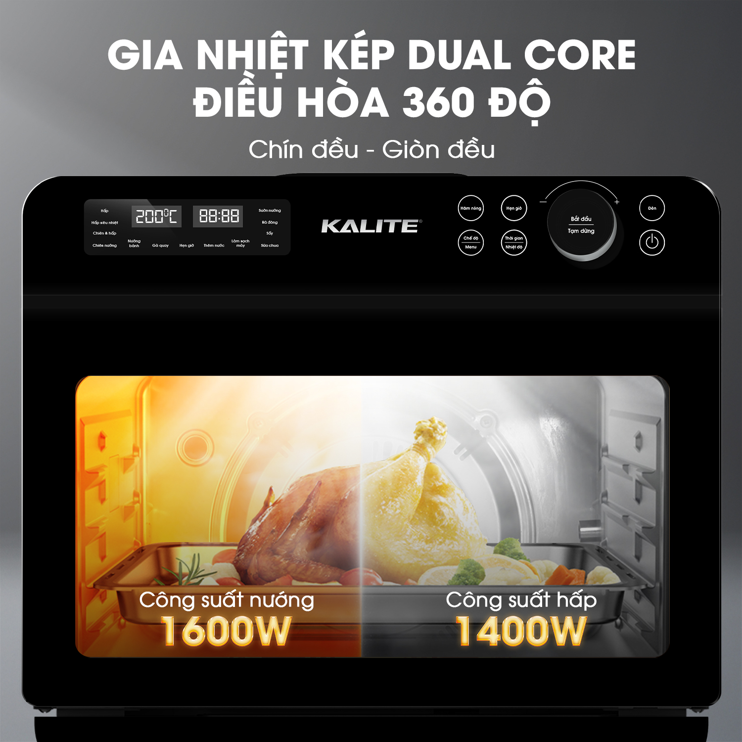 Hệ thống gia nhiệt kép Dual Core hoạt động từ hai phía, luân chuyển khí nóng thông minh 360 độ, giúp thực phẩm chín nhanh, chín đều mà không cần lật trở.