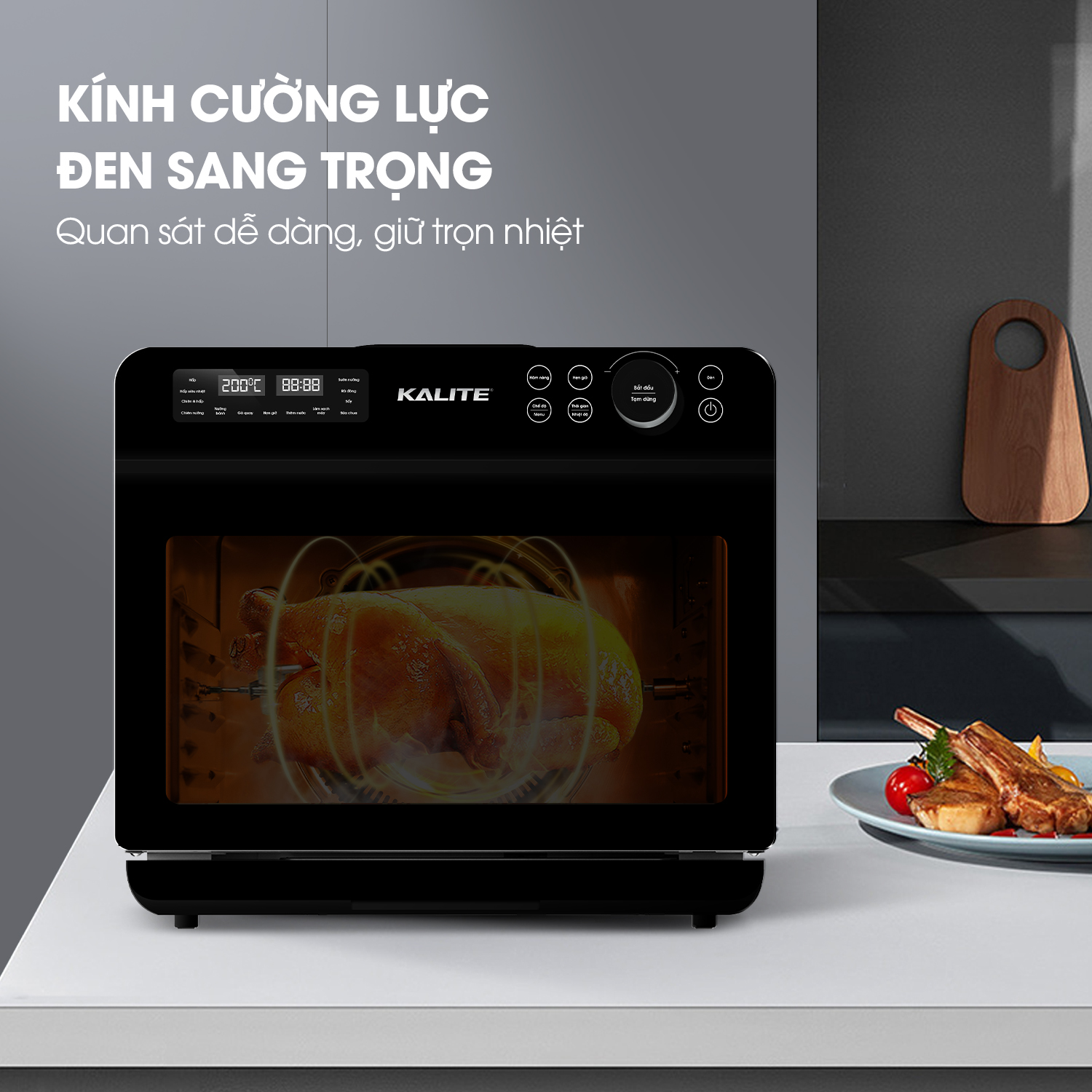Mặt kính cường lực màu đen cao cấp mang đến diện mạo hiện đại, sang trọng cho không gian bếp, phù hợp với xu hướng thiết kế tối giản và cao cấp. Dù có tông màu đen tinh tế, người dùng vẫn dễ dàng quan sát quá trình nấu bên trong nhờ hệ thống đèn lò chiếu sáng rõ ràng, không cần mở cửa, giúp giữ trọn nhiệt và hơi nước.